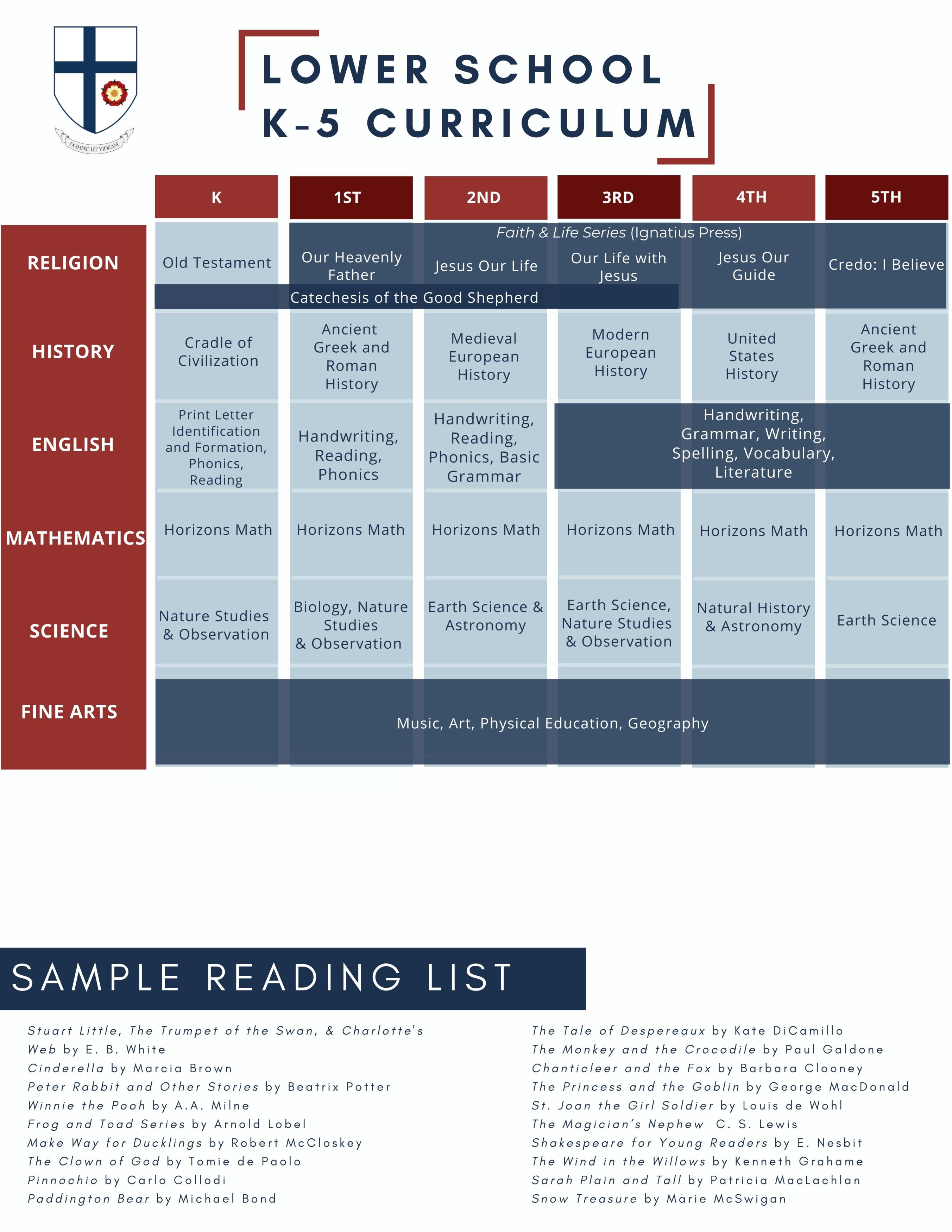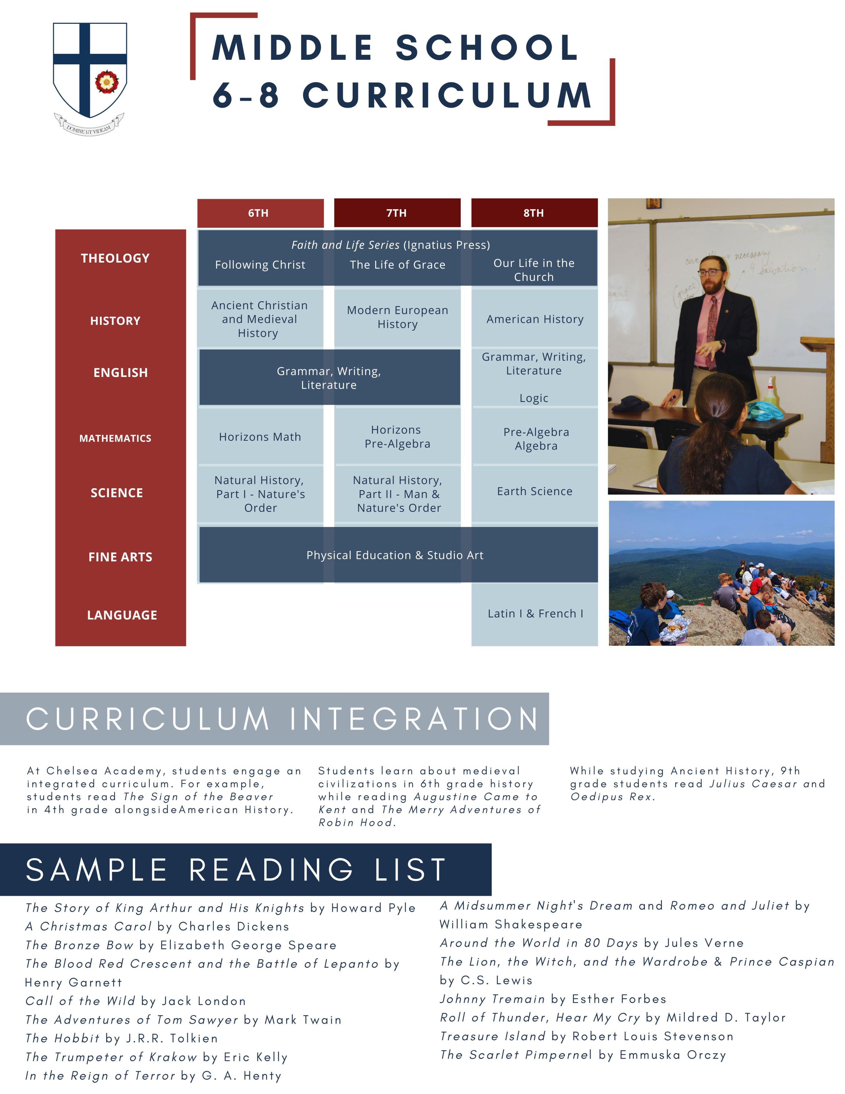 Students follow a traditional curriculum grounded in English literature, grammar and composition, Latin and French, history, religion, mathematics, science, and the arts. In addition to advanced mathematics, honors classes are offered in English, history, and science in grades 9-12. Religion classes introduce students to the teachings, history, and theology of the Catholic Church. Field trips reinforce and build on work done in the classroom. Logic is studied in 8th grade, and Middle School students take Art and Physical Education.