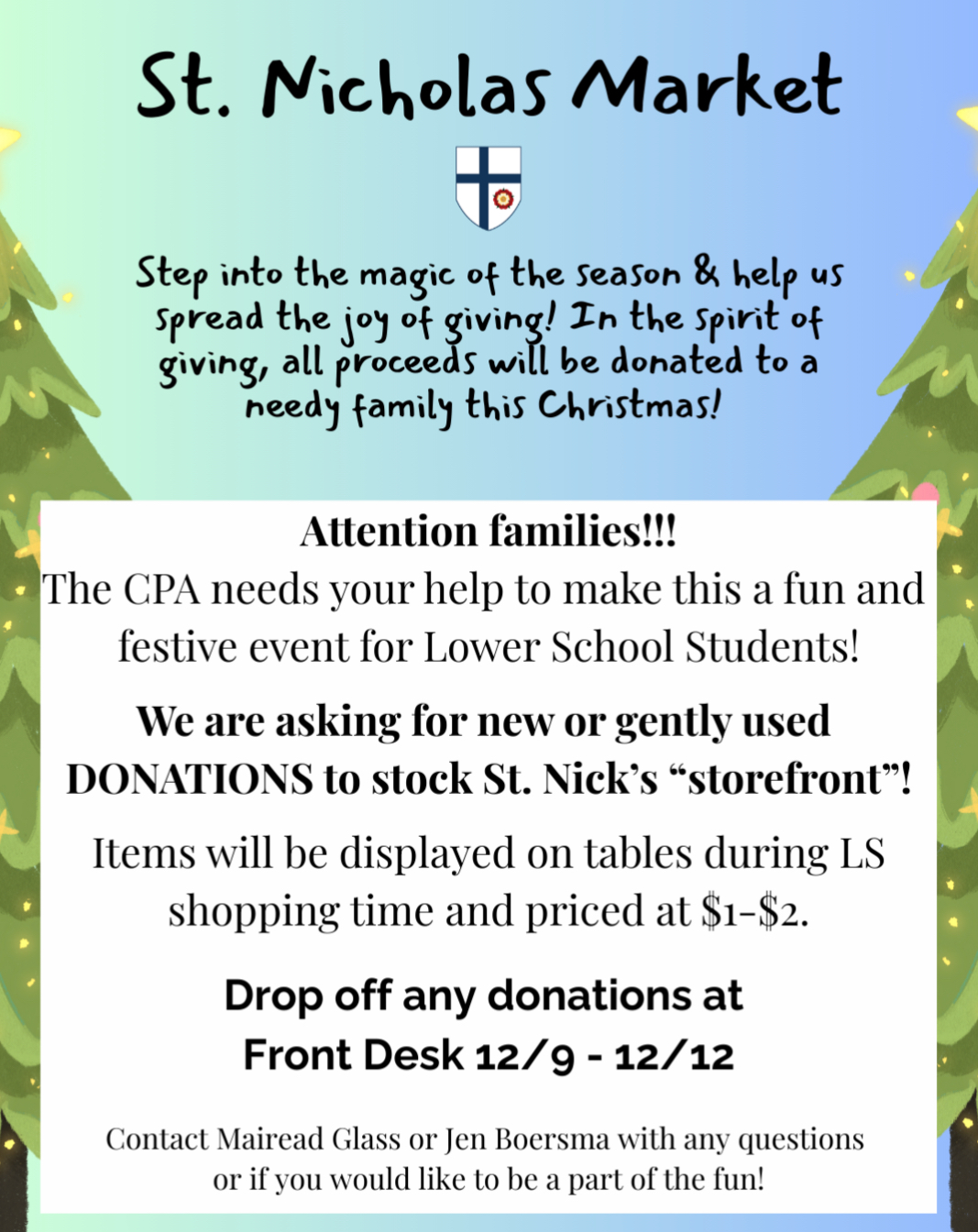 This year, the CPA is introducing our first St. Nicholas Market for the Lower School. Each class in K-5 will have a set time to come and shop. All items will be priced at $1-$2. Children should be sent with a shopping "list" of whom they are looking to buy for along with their cash. A "helper" will shop with them, and then help them wrap and label their gifts! What fun for them to have a little way to give to others at Christmas.