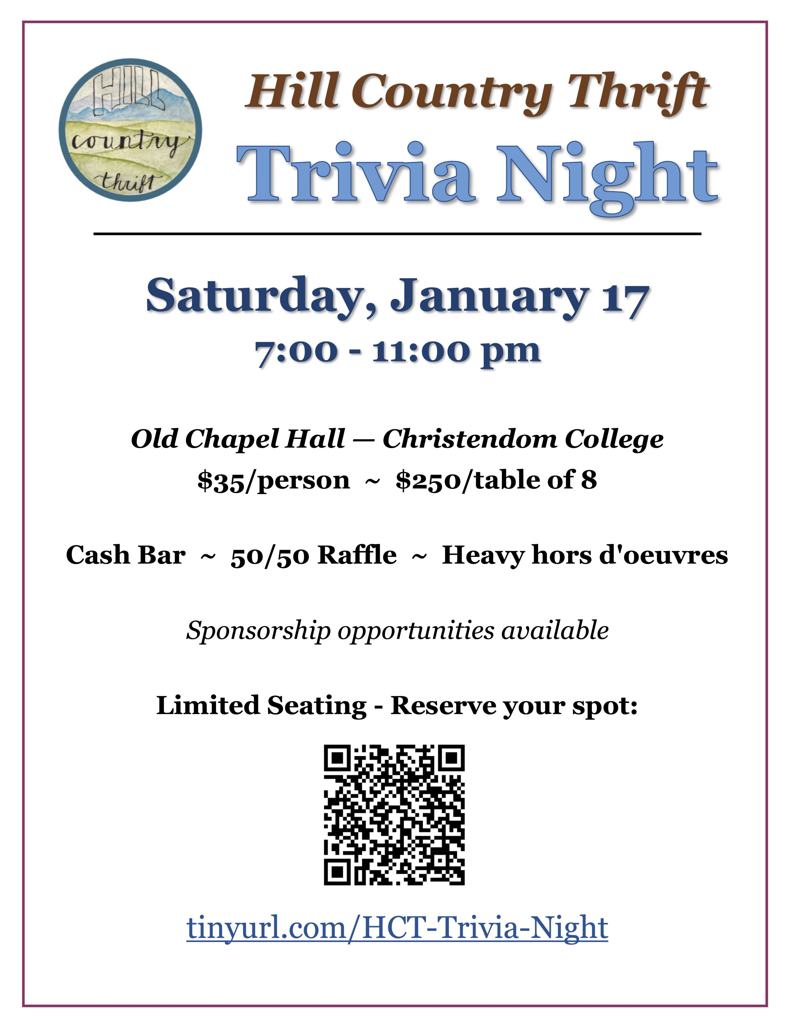 Hill Country Thrift, a new thrift store in support of the Front Royal Pregnancy Center is hosting a Trivia Night Fundraiser on Saturday, January 17, 7:00-11:00 pm in Old Chapel Hall at Christendom College. Chelsea parent Stephen Pilon founded Hill Country Thrift with other local business owners to provide funding for the FRPC and thrift store vouchers for their clients. The store will also benefit the broader community as a place to donate goods or shop for deals. They plan to have a store open in Front Royal by summer 2026. For more details, to buy tickets for the event, or to support the store financially, go to the HCT Trivia Night website. If you have questions please reach out to Stephen Pilon at info@hillcountrythrift.org or call 540-660-9628.